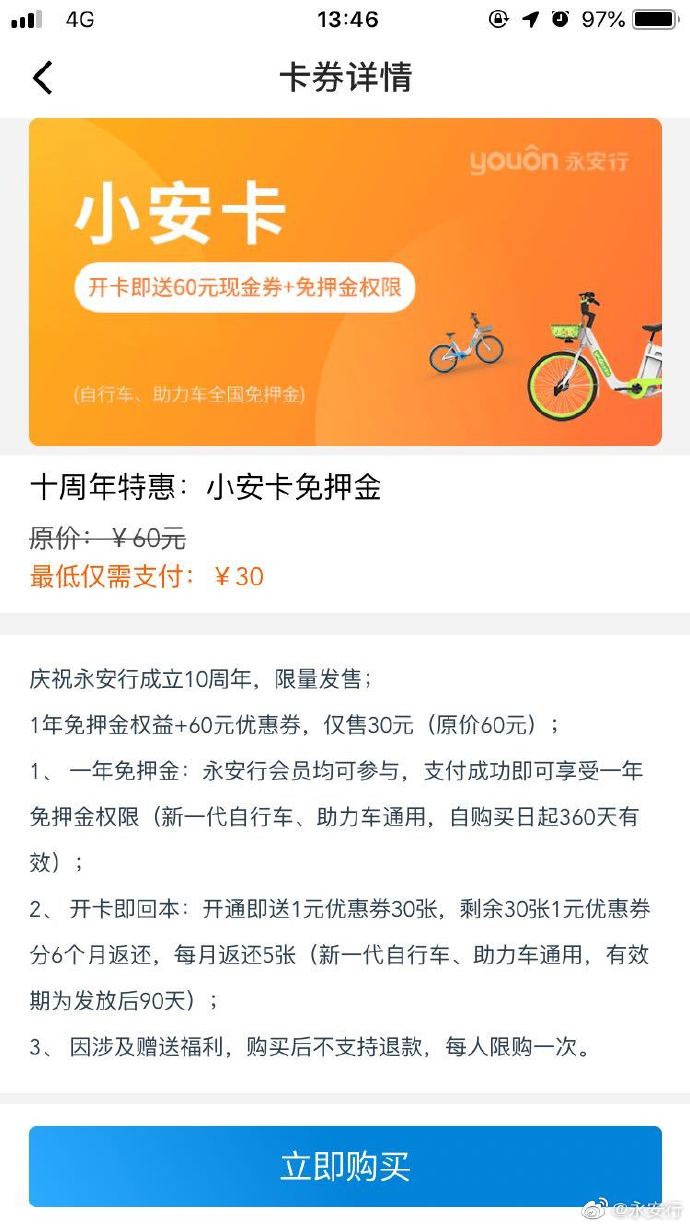 買30元小安卡贈送60元現(xiàn)金券(原價(jià)60元)打開永安行app-商城-出行福利進(jìn)行購買#因?yàn)橛腊?出行簡單#
