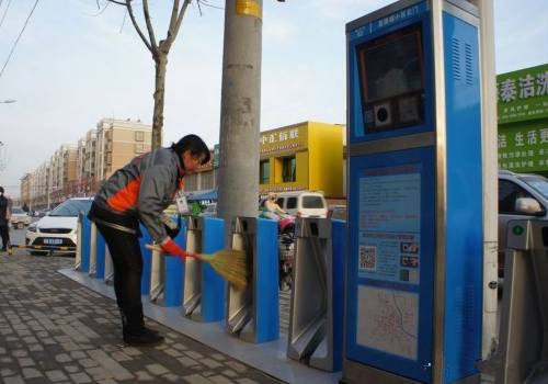存放了一整夜的“小綠”,車身上早已蒙上一層灰塵,李莉打開車筐,將抹布在水桶中清洗干凈,來(lái)回認(rèn)真擦拭著自行車車身和鎖車器,尤其是市民直接接觸到的刷卡區(qū)位置。隨后她拿起小笤帚掃落掉鎖車器卡口內(nèi)側(cè)的灰塵,打掃下周邊地面衛(wèi)生。立春后的清早,空氣中還滲透著絲絲寒意,記者此時(shí)的手腳已漸冰涼,但李莉的身影,卻一直忙碌在站點(diǎn)前。