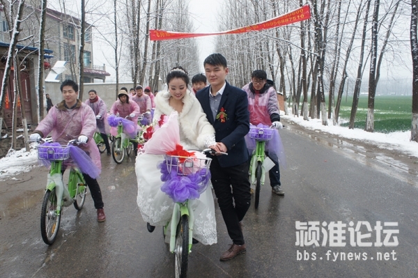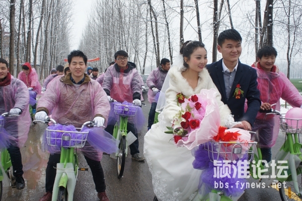 時(shí)云濤是一名年輕的90后,在阜陽臨沂商城從事門業(yè)生意。新娘名叫閆瑞金,是行流鎮(zhèn)高橋村人,新娘和新郎是高中同學(xué),兩人戀愛至今已經(jīng)走過了四五個(gè)年頭,大學(xué)期間兩人分隔兩地,新郎時(shí)云濤在大一時(shí)退學(xué)回家創(chuàng)業(yè),自主創(chuàng)業(yè)生意也是越來越紅火,事業(yè)有成接下來就要抱得美人歸了,結(jié)婚無疑是一件人生大事,這結(jié)婚就是要結(jié)的與眾不同,什么樣的結(jié)婚形式才能更別出心裁呢,時(shí)云濤在采辦結(jié)婚用品的時(shí)候,碰巧看見了停放在臨沂商城附近的公共自行車,時(shí)云濤就想如果用公共自行車當(dāng)婚車,不僅節(jié)能環(huán)保,而且整齊劃一,想想那齊刷刷排整齊的自行車迎親隊(duì)伍,效果應(yīng)該是不一般的吸引眼球吧,于是這個(gè)創(chuàng)意婚禮的念頭就這樣應(yīng)運(yùn)而生。