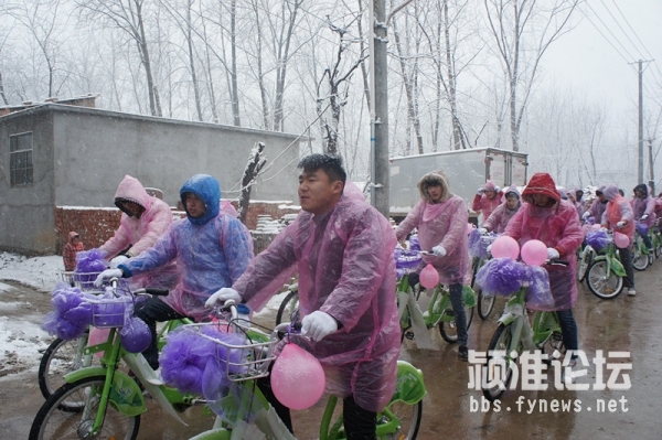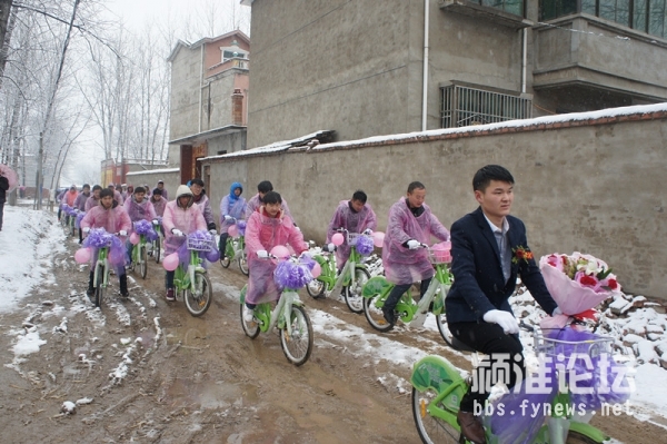 30輛公共自行車整齊碼開,時(shí)云濤“打頭陣”騎在最前面,后面時(shí)云濤的親朋好友們,四人一排,整齊劃一。因?yàn)橐恢痹谙麓笱?,新郎的家人還特別貼心的為騎自行車的人們準(zhǔn)備了防寒的手套和粉色的雨衣,穿著小粉,騎著小綠,浩浩蕩蕩去新娘家迎親去,一支騎著公共自行車的婚車隊(duì)伍“招搖過街”也是賺足了回頭率,有不少路人駐足觀看,沿街接受路人的祝福,再配上這漫天大雪,簡直太浪漫了。新娘閆瑞金告訴記者:“時(shí)云濤平時(shí)在生活中就是一個(gè)非常浪漫的人,兩人在談戀愛時(shí)就經(jīng)常會(huì)想出許多有創(chuàng)意的點(diǎn)子我開心,這次用公共自行車來迎親也是讓我非常意外,而且也非常有紀(jì)念意義,我相信這個(gè)婚禮會(huì)讓我終身難忘。外面一直在下雪,我也非常感動(dòng),他也和迎親隊(duì)伍一路騎車過來,相信我們以后一定會(huì)幸福到永遠(yuǎn)?!?/div>