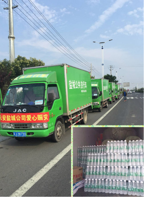 在天災面前,我們顯得那么渺小和無力,在抗災救災時,我們愛心力量大,我們一直與阜寧、射陽同在。鹽城公共自行車中心發(fā)起愛心捐贈,用善款購買了礦泉水、方便面、油布、被褥、床席、蚊香等救災物資,送往災區(qū),給受災群眾送去溫暖,用實際行動援助災區(qū)的兄弟姐妹。