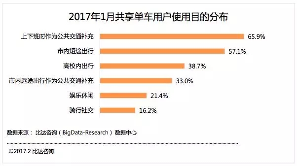2017年1月共享單車用戶使用目的分布,上下班通勤作為交通補充最多,達65.9%;市內(nèi)短途出行為57.1%;高校內(nèi)出行38.7%。