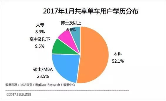 2017年1月共享單車用戶學歷分布方面,本科占比最多,達52.1%;碩士/mba占23.5%;高中及以下占9.5%。