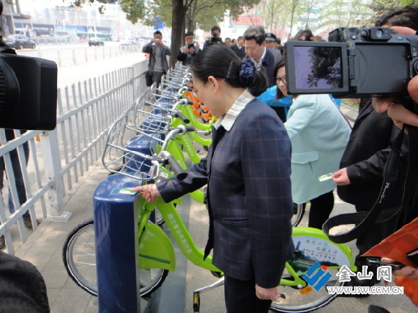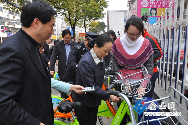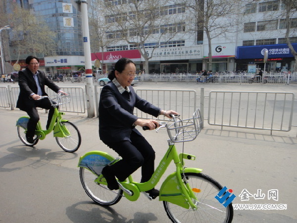 在大市口廣場上,朱曉明、雷志強(qiáng)一行首先閱讀了標(biāo)注有公共自行車使用方法和車位分布圖的展牌。朱曉明要求市城管部門更廣泛地宣傳使用方法和車位分布圖,讓更多市民知曉,并在試運(yùn)行的一個(gè)月中及時(shí)聽取他們的意見和建議,隨時(shí)加以改進(jìn),以便5月1日正式運(yùn)行時(shí)給市民帶去更多方便。隨后,朱曉明、雷志強(qiáng)及有關(guān)部門負(fù)責(zé)人來到位于房產(chǎn)交易中心外的車位上各自取了一輛自行車騎上了解放路。